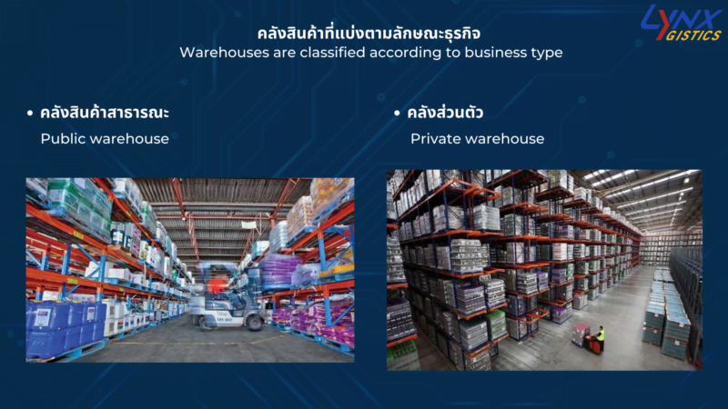 คลังสินค้าที่แบ่งตามลักษณะธุรกิจ แบ่งออกเป็น 2 ชนิด ได้แก่ คลังสาธารณะ และ คลังส่วนตัว