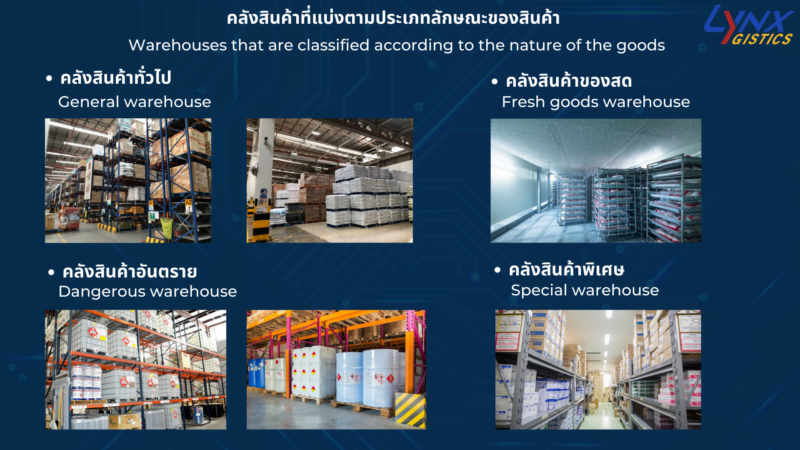 คลังสินค้าที่แบ่งตามประเภทลักษณะของสินค้า แบ่งออกเป็น 4 ประเภท ได้แก่ คลังสินค้าทั่วไป คลังสินค้าของสด คลังสินค้าอันตราย และคลังสินค้าพิเศษ